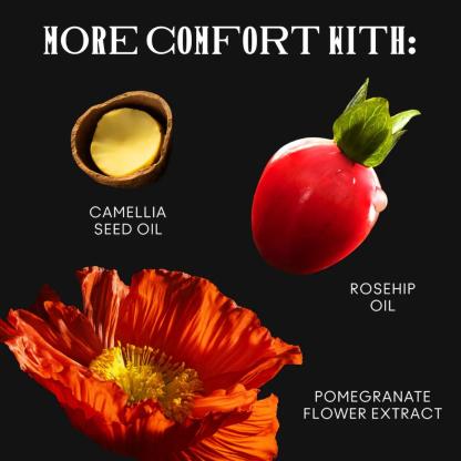 - Conditions lips with camellia seed and rosehip oils